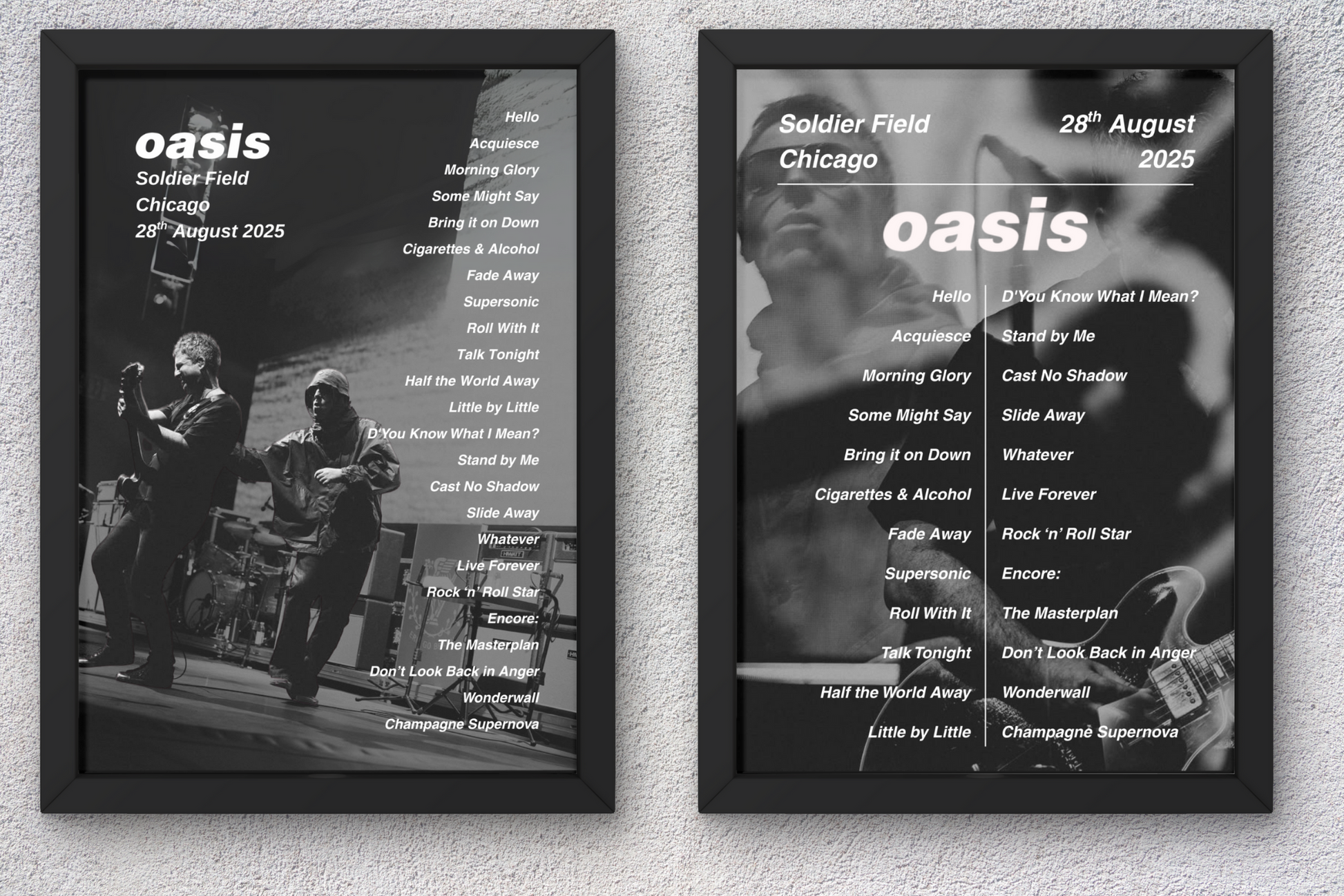 OASIS CHICAGO LIVE 2025 SETLIST POSTER | A1 - A5 w/Frame Option