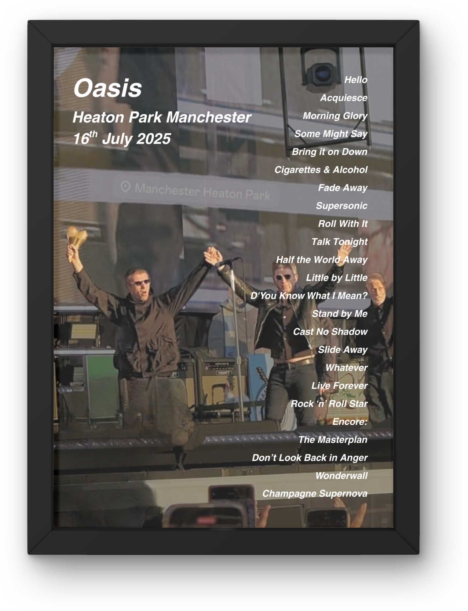 OASIS LIVE 2025 SETLIST POSTER | 16th JULY MANCHESTER HEATON PARK | A1 - A5 Frame Option