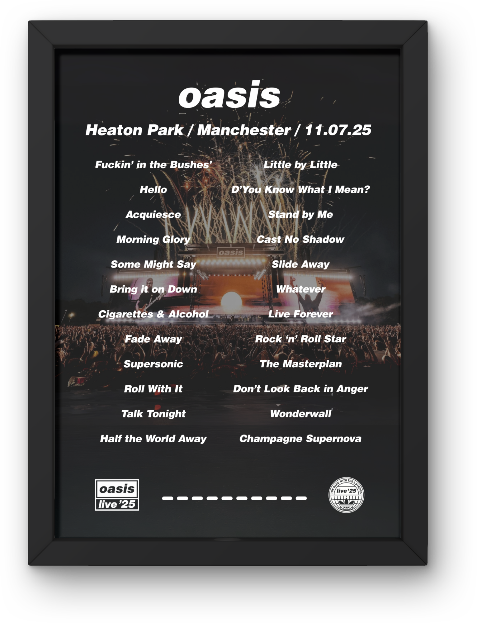 OASIS MANCHESTER LIVE 2025 SETLIST POSTER | A1 - A5 W/Frame Option