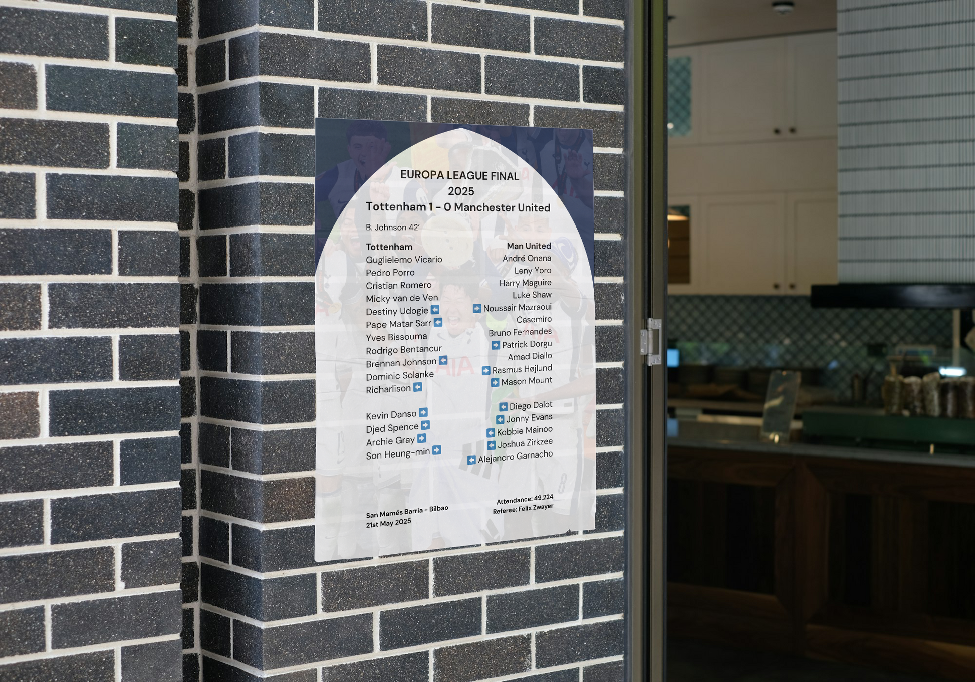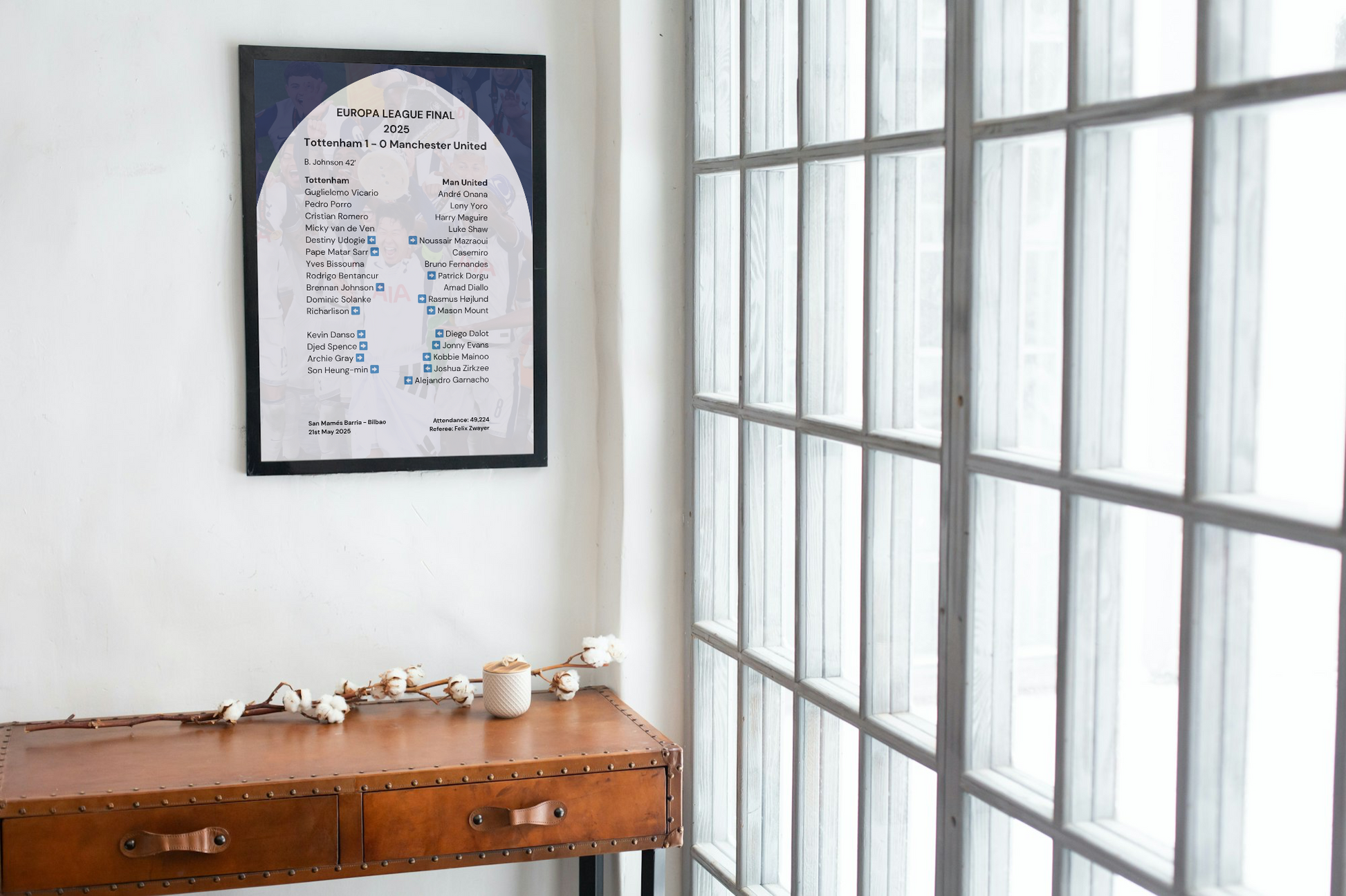 The product is a poster featuring a scene from the UEFA Europa League Final between Tottenham Hotspur and Manchester United. The poster comes in a range of sizes from A1 to A5 and can be framed for display. It is a piece of football memorabilia that would be a great addition to any Tottenham Hotspur fan's collection. The image on the poster captures an exciting moment from the historic match, making it a desirable item for fans of both teams |